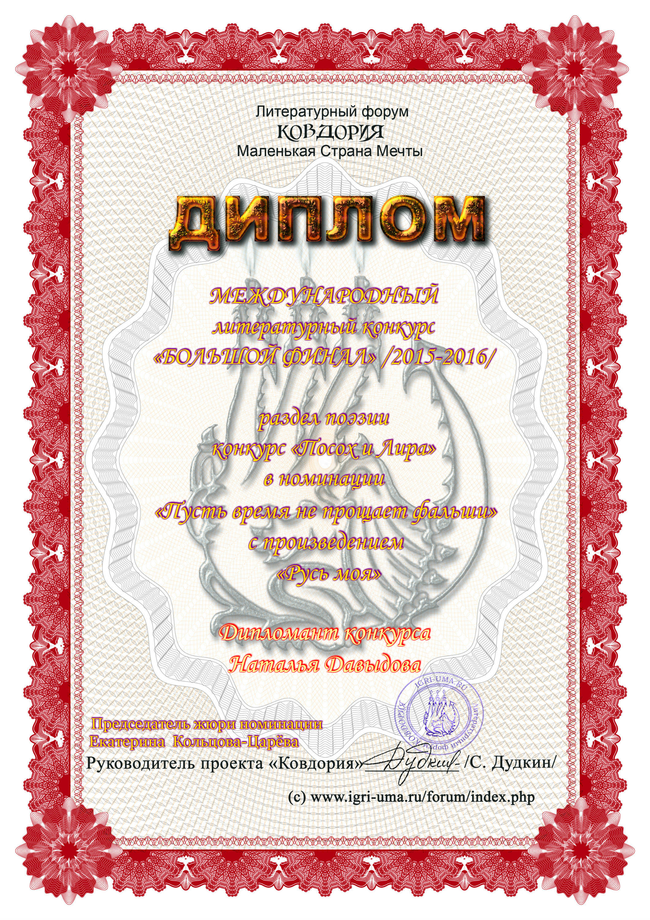 •Дипломант Международного Литературного Конкурса «Большой Финал» раздел поэзии «Посох и лира», номинация«Пусть сердце не прощает фальши» 2015-2016 год