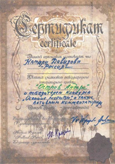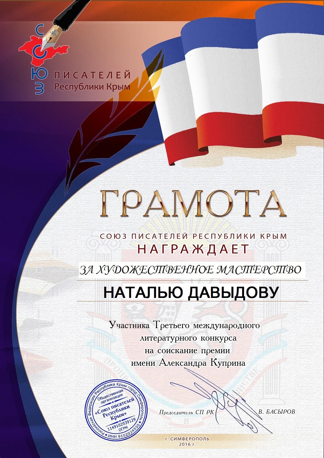 •Третий международный литературный конкурс на соискание премии имени Александра Куприна. Грамота за художественное мастерство.Союз Писателей Республики Крым. 2016 год.