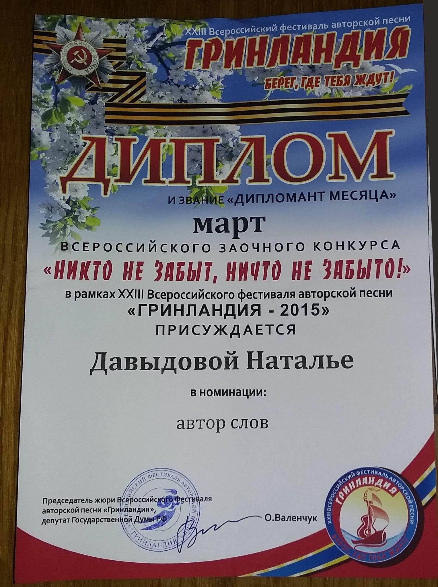 • Дипломант Всероссийского Фестиваля авторской песни "Гренландия". март 2015 год,2018 год дипломы в номинации "Автор слов" и "Основной конкурс".