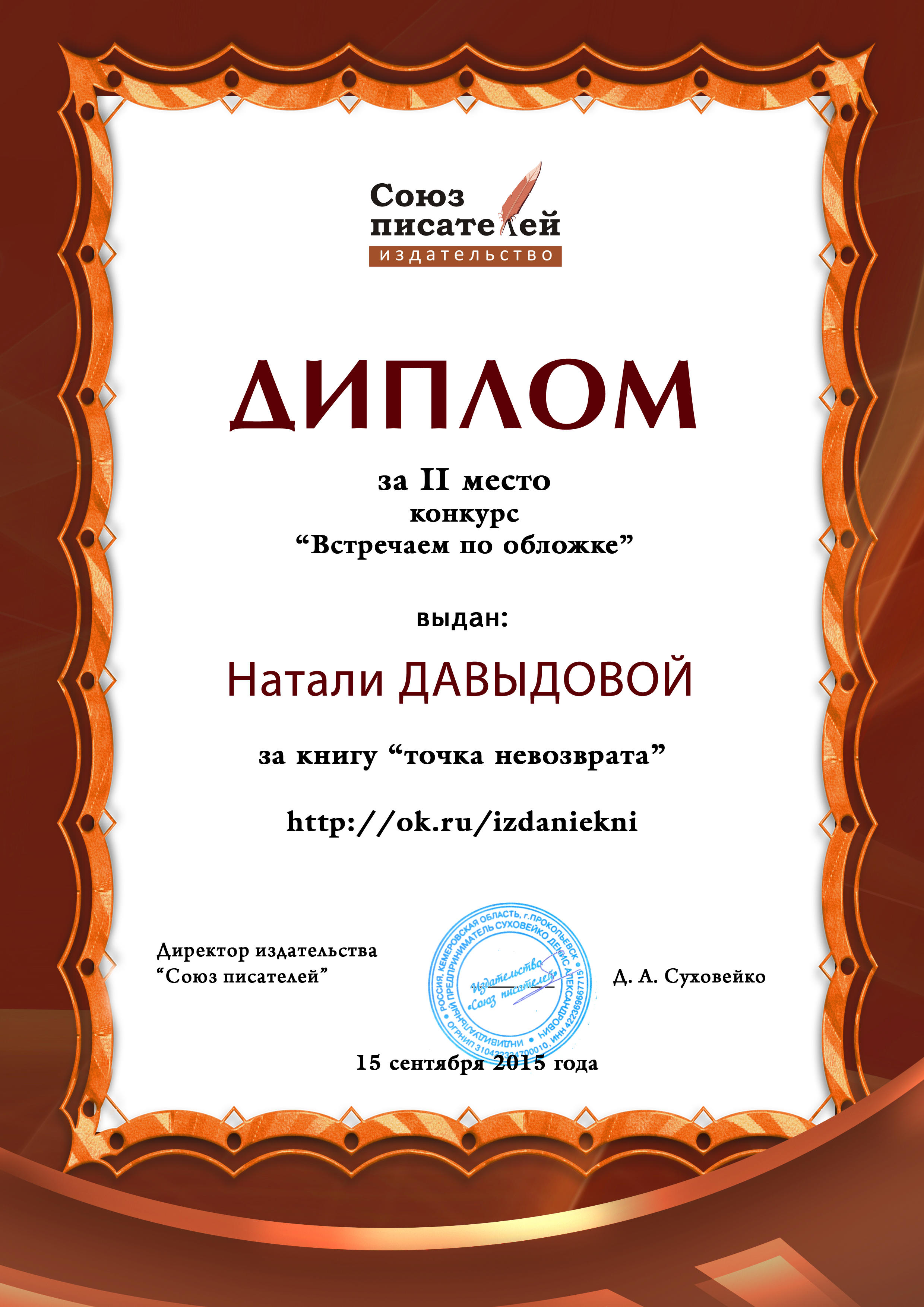 • Финалист литературного конкурса ПРОЕКТ КНИГА 2 - 2014 год. Днепропетровск.