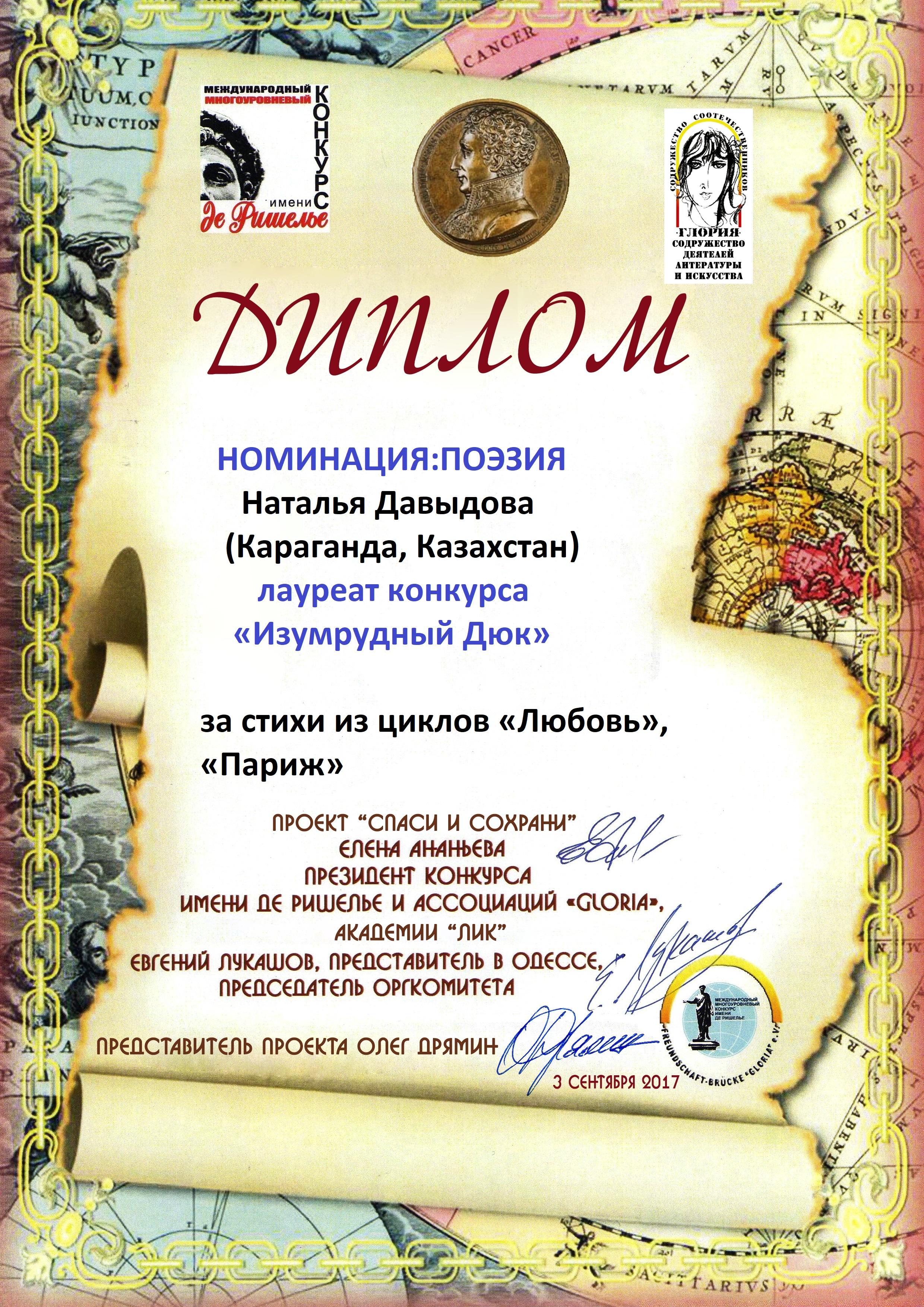 •Лауреат "Изумрудный Дюк" в номинации "Поэзия" Международного многоуровневого конкурса имени де Ришелье-2017 г.
