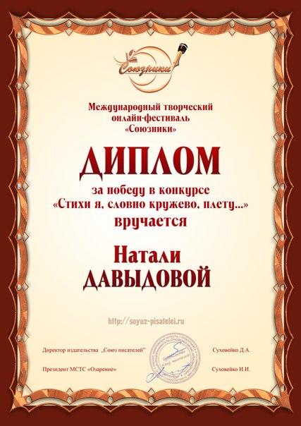 • 3 место на Международном фестивале "Союзники", мини конкурс "Стихи я, словно кружево плету"-2014год.