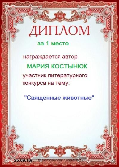 Да, работа Марии Костынюк - лучшая. Справедливое первое место. А вот работу "Священный Кузя" хотелось бы видеть на 2-ом месте. (Ни в коем случае не хочу обидеть автора, занявшего второе место). Только начала её читать и сразу подумала, что автор -Игорь Филатов - здесь его неповторимая манера написания. Потрясающе правдивая история, воспоминания о которой автор носит в душе до сих пор. Можно только представить, как переживали мальчики, видя на какую жестокую смерть, обрекли своего любимца. Сожаление и раскаяние, вот что слышится в финальных строчках этого рассказа. Если Поэмбук создаст когда-нибудь собственную "Золотую коллекцию" лучших авторских работ, этот небольшой рассказ достоин, быть включенным в её список.