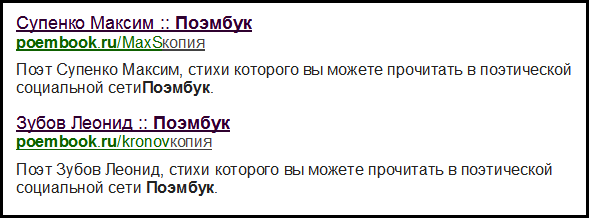 Всякому зарегистрированному пользователю Поэмбука (как и прочих аналогичных сайтов) независимо от качества выложенной писанины автоматически присваивается звание поэта с занесением в поисковик.