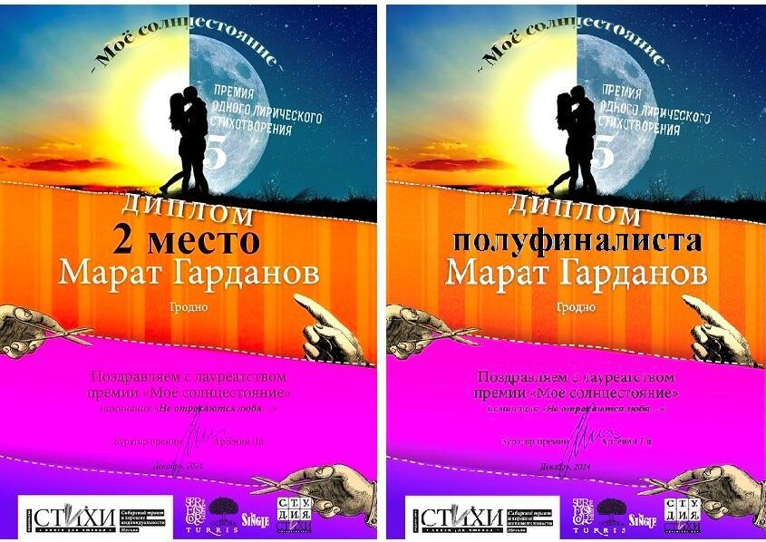 Получить сразу два диплома в одном всероссийском или международном литературно-поэтическом конкурсе/премии – редкий случай. Хотя было даже такое, что в Международном конкурсном фестивале 2018-го года «Русский Stil», проходившем в Болгарии, я стал обладателем аж трёх дипломов. И вот нынче по результатам Всероссийской поэтической премии «Моё солнцестояние» под эгидой Московского издательства «СТиХИ» удостоился звания дипломанта одновременно в двух из трёх конкурсных номинаций (в третьей я не участвовал). На эту премию было подано 537 заявок из 11 стран мира. Я по своим номинациям оказался в лонглисте числом 57 конкурсантов.