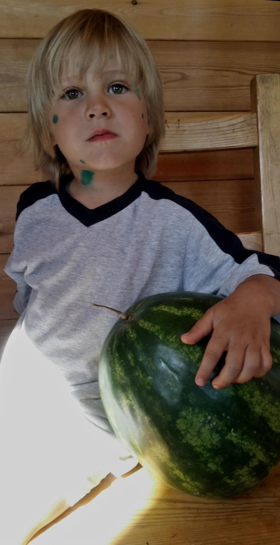 Первые пару дней нам, переболевшим родителям переболевших - за вычетом младшего - детей даже несколько смешно. Мы иронизируем на тему "угораздило" и устраиваем идиотские тематические же фотосессии: пятнистый мальчик и надувная лягушка из бассейна, пятнистый мальчик и гулкий арбуз с рынка. Мальчик бодр, на всё согласен, после фотосессий играет лягушкой в футбол и ныряет мордой в арбузную мякоть.