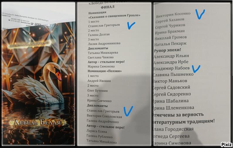 Сегодня получила Дойче почтой Литературный альманах по итогам фестиваля Лебедь белая 2024, где я была в жюри, а в участниках, оказывается, некоторые поэмбуковцы) И преуспели ведь! Карыч сразу в двух номинациях, Виктория -"Автор- стильное перо!", а Никсан - "Рупор эпохи!"