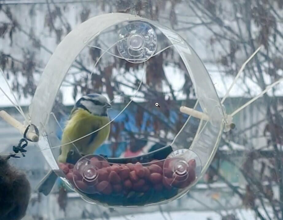Дочка сделала кормушку на стекле кухонного окна для синичек и воробышек.