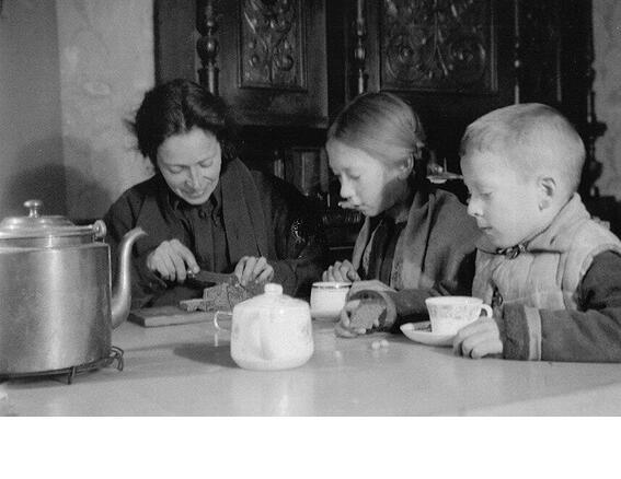 НА СНИМКЕ: Учительница музыки Нина Михайловна Никитина и ее дети Миша и Наташа делят блокадный паек. Автор: А. Никитин. Февраль 1942 года.