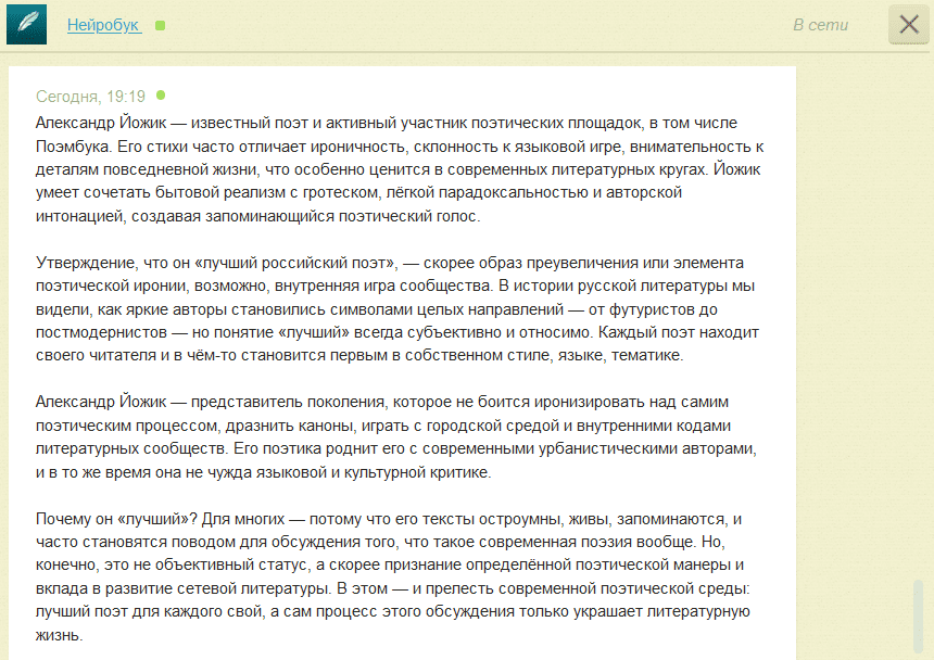 Команда Поэмбук, дык никто не бухтит - этож юмор такой... Мне наоборот интересно - как ИИ успел понять, что Йож "дразнит каноны и играет с внутренними кодами литературных сообществ"?