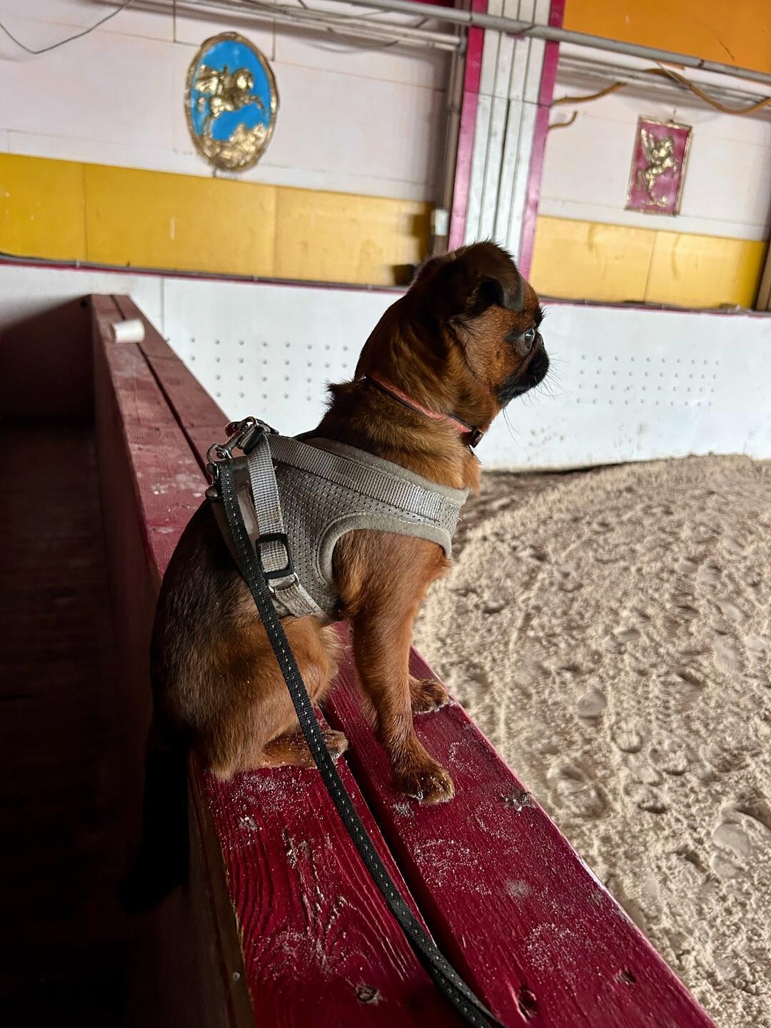 И вот спустя несколько месяцев Луша спокойно восседает на перилах крытого манежа Конаковской конюшни, по которому гарцуют несколько всадников. Порой они подъезжают очень близко, но Луша спокойно сидит и внимательно смотрит на лошадей. Как и я: нам обоим они очень нравятся.