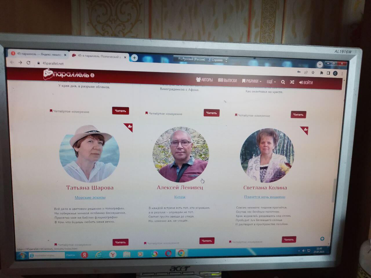 Когда-то здесь на Поэмбуке была Чернышова Галина. Она и познакомила меня с альмонахом 45-я параллель, куда часто заходила для чтения стихов. Её, кстати, как-то там опубликовали. Я несколько раз посылала туда свои вирши. И вот. Чудо! Хвастаюсь!!! (Такая мысль маленькая гаденькая дёгтерная: совсем что ли плохо с поэтами, если даже меня заметили?) Но приятно! Люблю, когда меня хвалят))))) А ведь эта публикация - не хурлы-мурлы - статусная!
