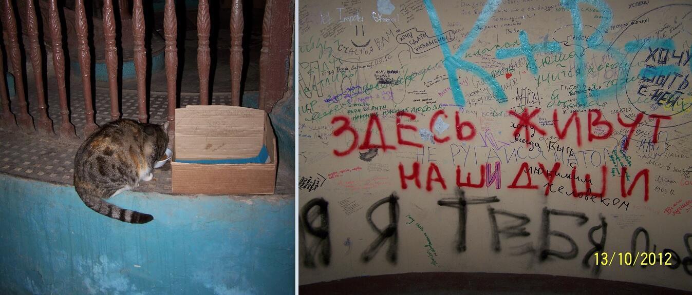 p.s. На фотографии - кошка, когда-то обитавшая в Ротонде. И стена пожеланий, там же (когда-то Ротонда была именно такой, разукрашенной всяческими желаниями). А Ротонда у нас одна, на улице Гороховой. Вблизи от неё (на той же самой Гороховой, к юго-востоку) проживал Распутин. А между ними, во дворе запрятался дом-кольцо. Всезнающая Википедия уверяет, что где-то около него одно время жили родители Пушкина.