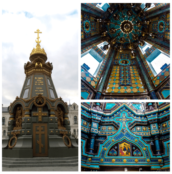 Потом я выросла и узнала, что этот памятник поставлен в 1887 году гренадерам, павшим за 10 лет до того в битве с турецким гарнизоном под городом Плевен в Болгарии, когда Российская империя помогала балканским братьям-христианам свергнуть османское иго. Потом ещё узнала, что это часовня, освящённая в честь иконы Божией Матери "Знамение" и святого благоверного князя Александра Невского. Говорят, что раньше она вроде бы была бело-голубая с золотом, а чёрной стала много позже, но сколько я ни находила старых фото - на большинстве тёмная, а на других непонятно - белая она, голубая, серая или какая ещё. А нынче с расцветкой промахнулись, я считаю - как-то терракота эта не вдохновляет. Но лучше так, чем никак)