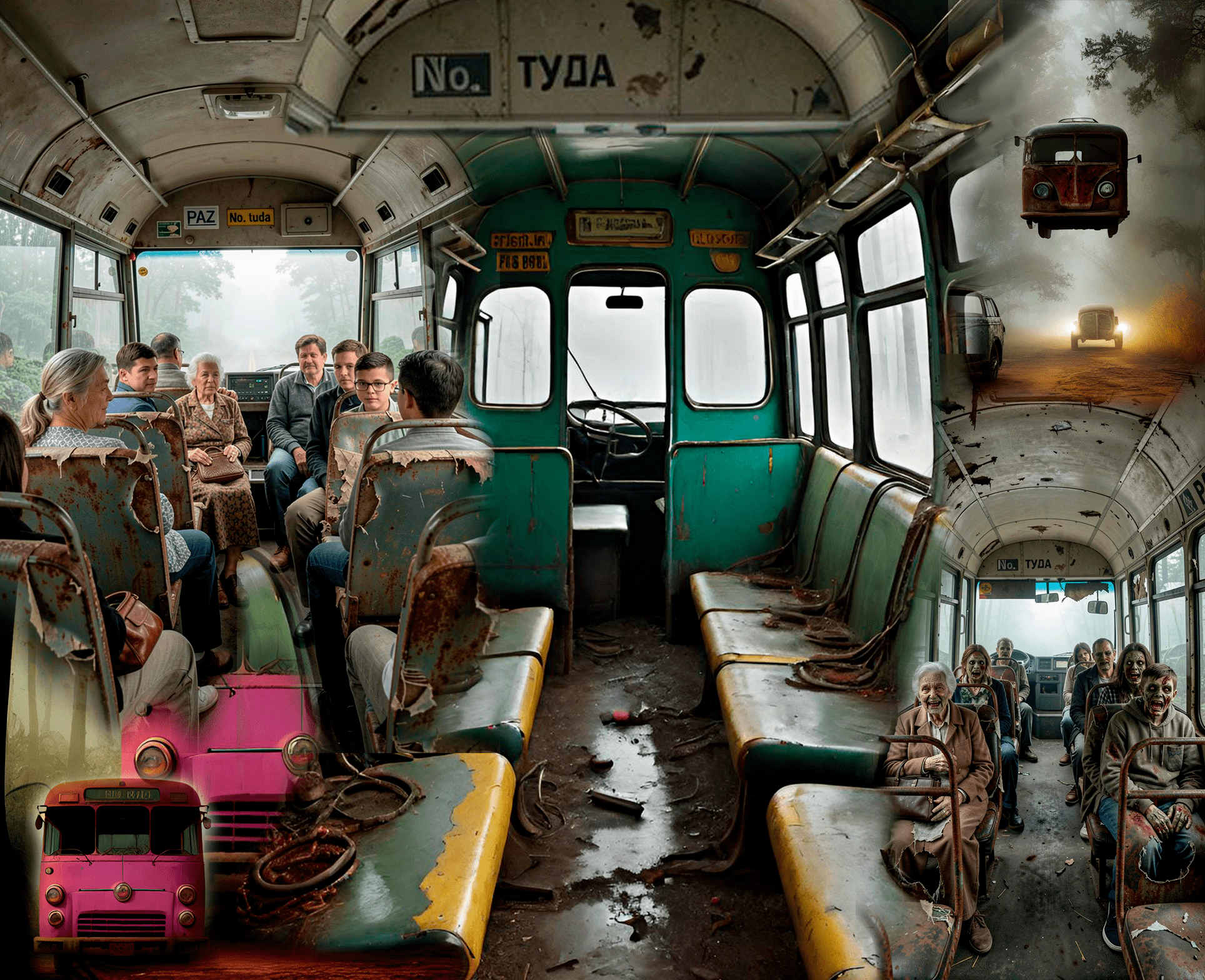 Автобус всё также монотонно покачивался и несся куда-то вперёд на громадной скорости. Из-за спинки водительского сидения была видна качающаяся в такт фигура водителя в драном, полуистлевшем пиджаке. Кости пальцев намертво приклеились к подёргивающемуся рулевому колесу.
