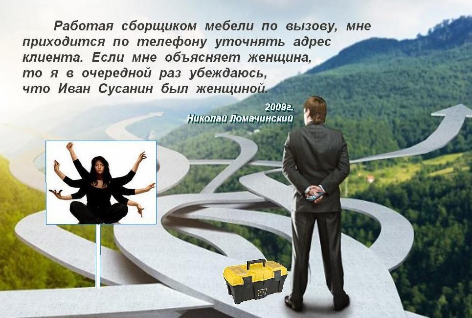 Работая сборщиком мебели по вызову, мне приходится по телефону уточнять адрес клиента. Если мне объясняет женщина, то я в очередной раз убеждаюсь, что Иван Сусанин был женщиной.
