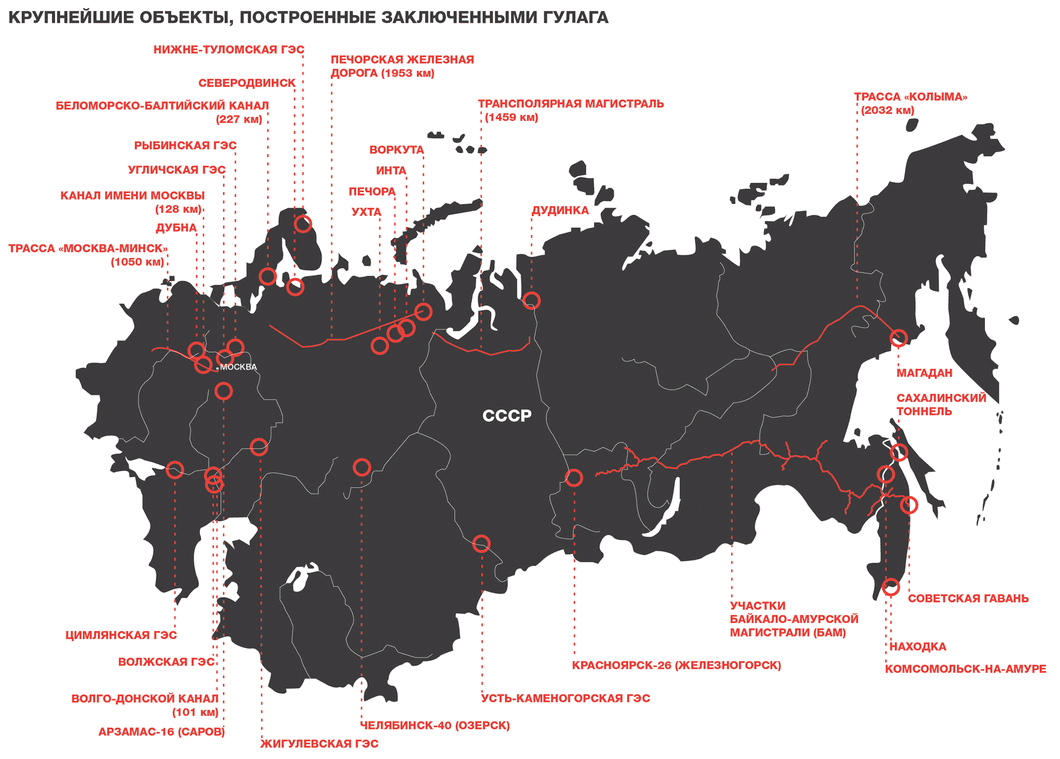 Все крупнейшие гидроэлектростанции начинались с Главгидростроя ГУЛАГа. Города Комсомольск-на-Амуре, Советская Гавань, Находка, Магадан, Дудинка, Воркута, Ухта, Инта, Печора, Молотовск (Северодвинск), наукоград Дубна — построены заключенными.