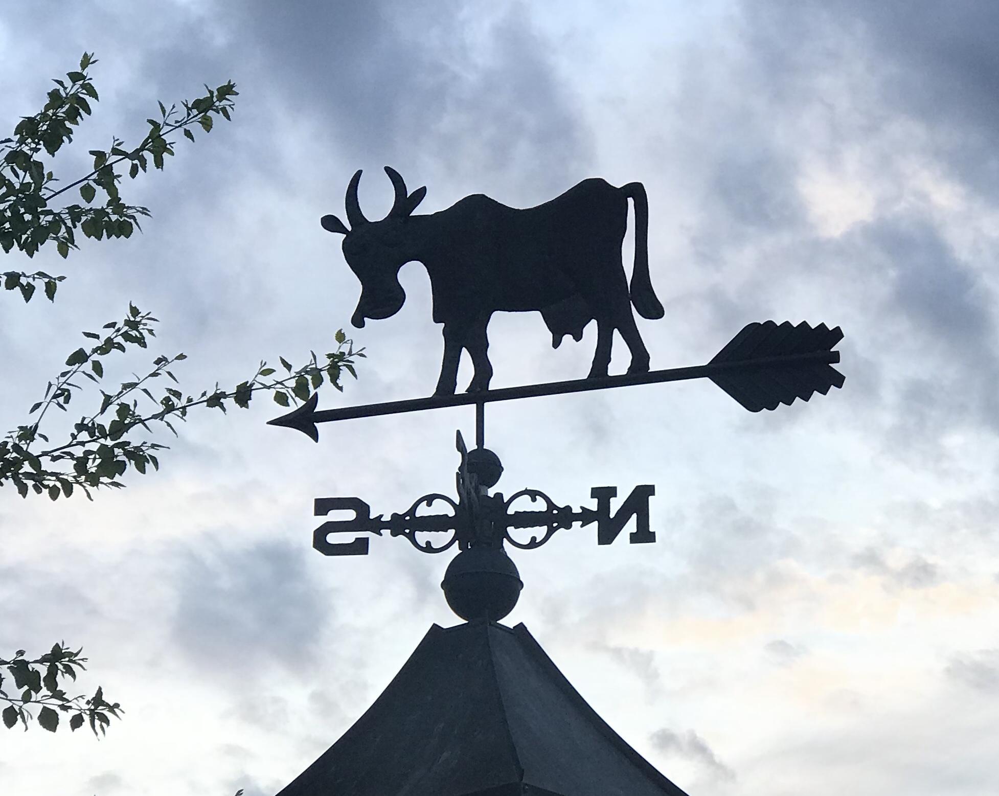 Был хорошо девятый час. Смеркалось. Очередюга стояла какая-то невероятная, в четыре хвоста (там несколько окошек). Я высадил жену занять очередь и поехал парковаться в поле: возле ларька все места были заняты. И в поле заняты. (А бывает, на ферме почти никого нет)) Едва нашёл, куда бы приткнуться, метрах в ста от раздачи... честное пионерское! И вот подхожу к очереди, а там на крыше сарайчика, да на фоне неба вот это чудо... Пока стояли в очереди, стихотворение в общих чертах и придумалось))