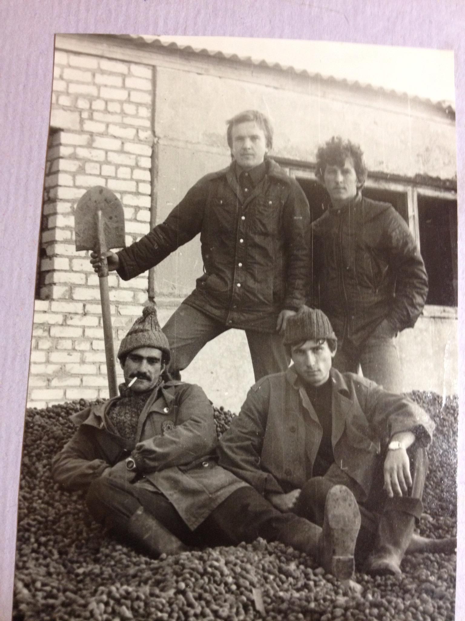 Работали от души, не сачкуя. До седьмого пота и от забора и до обеда. На обед сходились группами. На «Приятного аппетита» хором отвечали «Не твоё дело». Готовили нам три девушки, одна прехорошенькая. И вот в эту прехорошенькую по уши влюбился Аркаша, выше, на фото, с лопатой на караул. Юный и стеснительный.