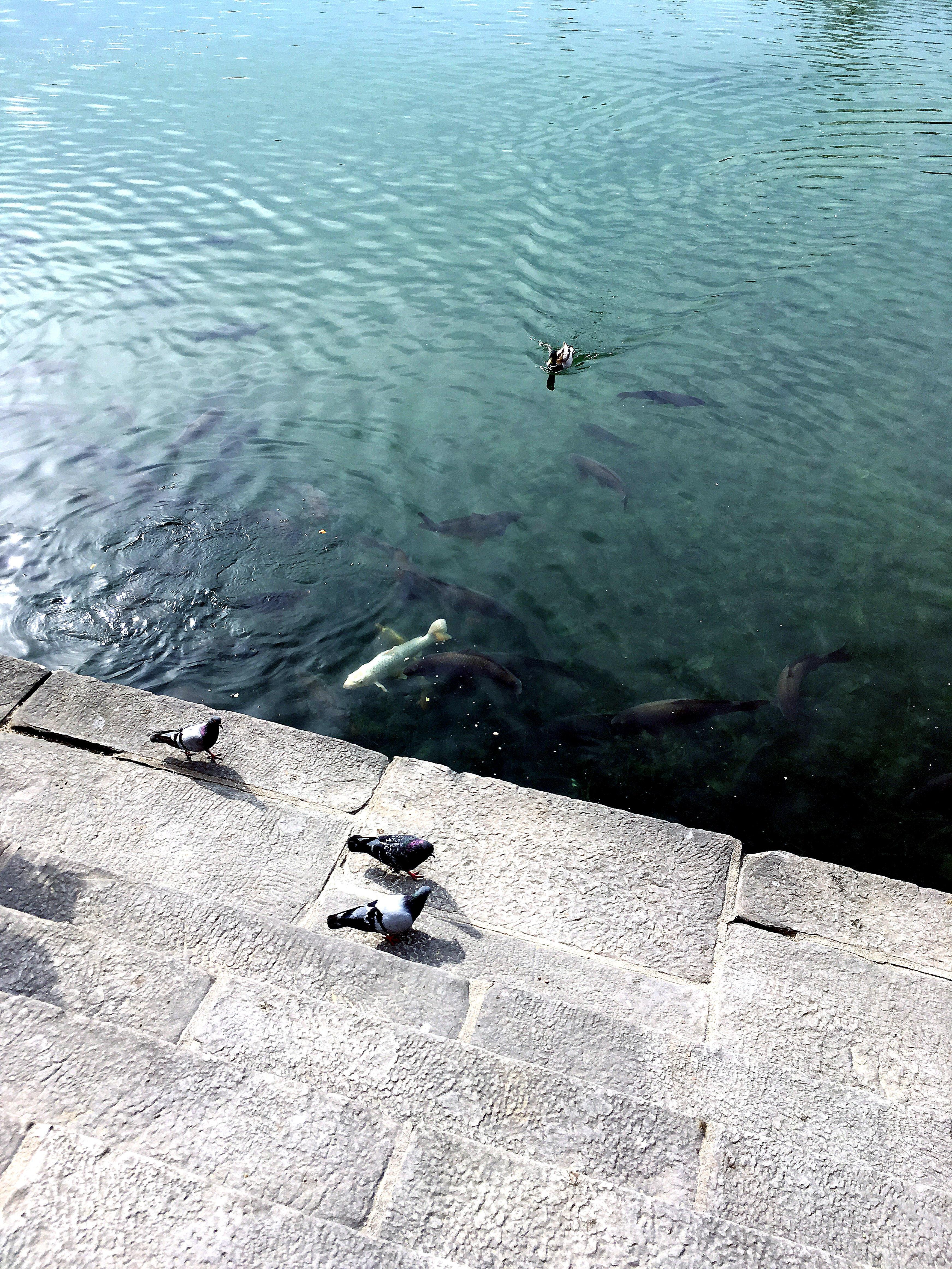 Люди бросают корм. Естественно, тем, кто сверху сподручней. В данном случае, уткам. Карпам это, понятно, не по душе — понаехали тут!