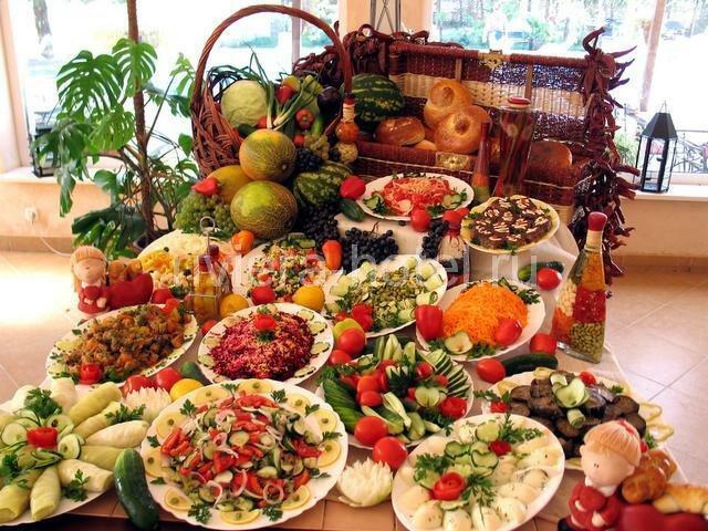 Мясное ассорти, из овощей всех мыслимых цветов стоят салаты,