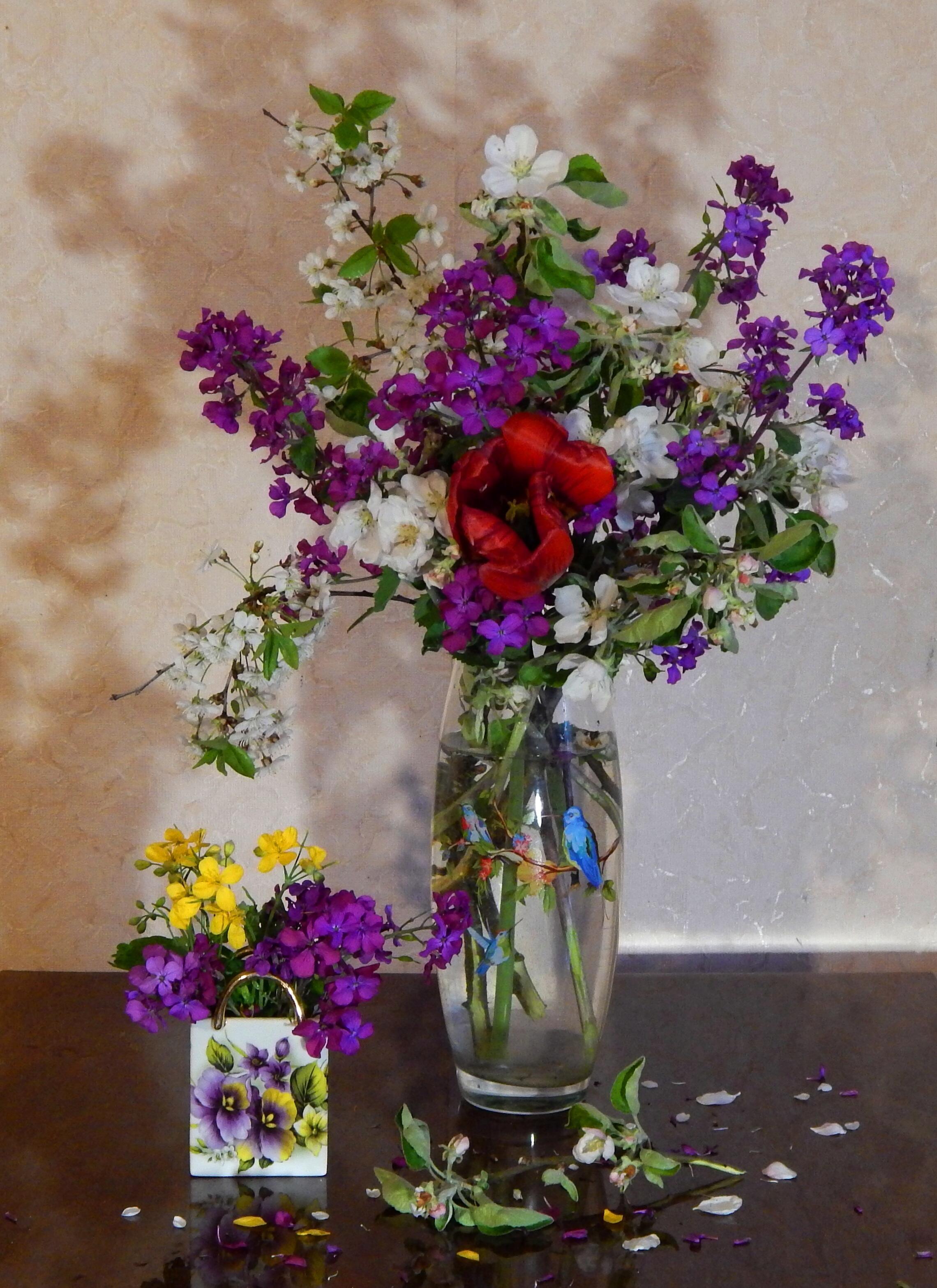 природа берёт своё.. ветерок колышет свежую зеленъ в которой прячутся букетики вероники и золотые одуванчики залившие полянки солнышком.. отцветают тюлъпаны.. и поднимаются вот эти фиолетовые то ли фиалки сенполии то ли флокс кингы, их называют денежное дерево потому что потом висят монеты по осени..