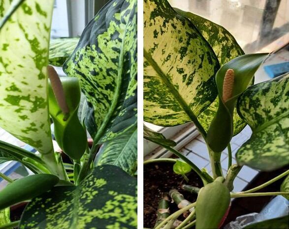 Так вот и я впервые вижу, чтоб они зацвели. У дочки и у невестки уже 3 года они живут на балконе, но никогда не цвели. Может быть, действительно у меня им комфортно, потому что наш дом расположен в глубине между двумя соседними домами. И у нас никогда не бывает яркого солнца. А диффенбахия очень боится прямых солнечных лучей. И поливать их надо не чаще 1 раза в неделю тёплой водой...